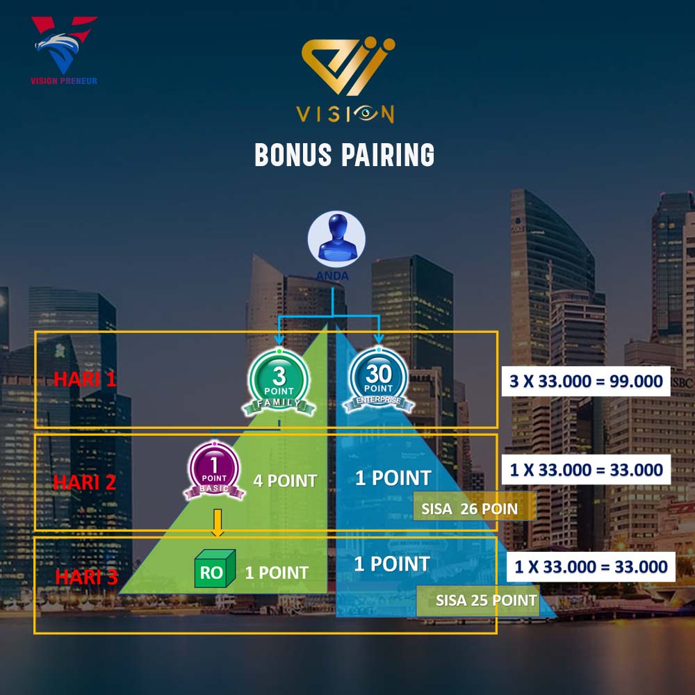 Aiivision memberikan Bonus Pairing (pasangan) SENILAI RP. 33.000/PASANG ketika terjadi pasangan POIN kiri kanan , baik rekrut maupun belanja ulang pribadi atau grup. Mantap bukan?
