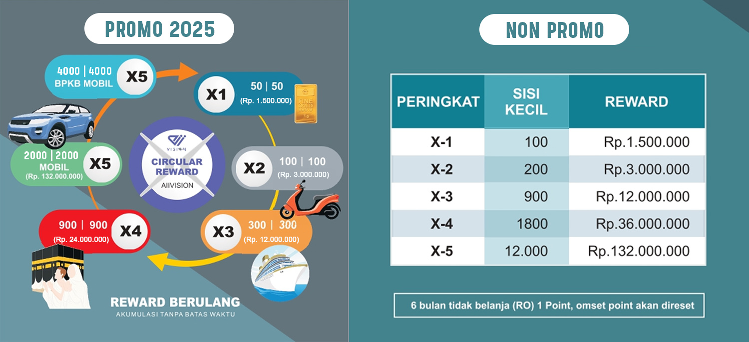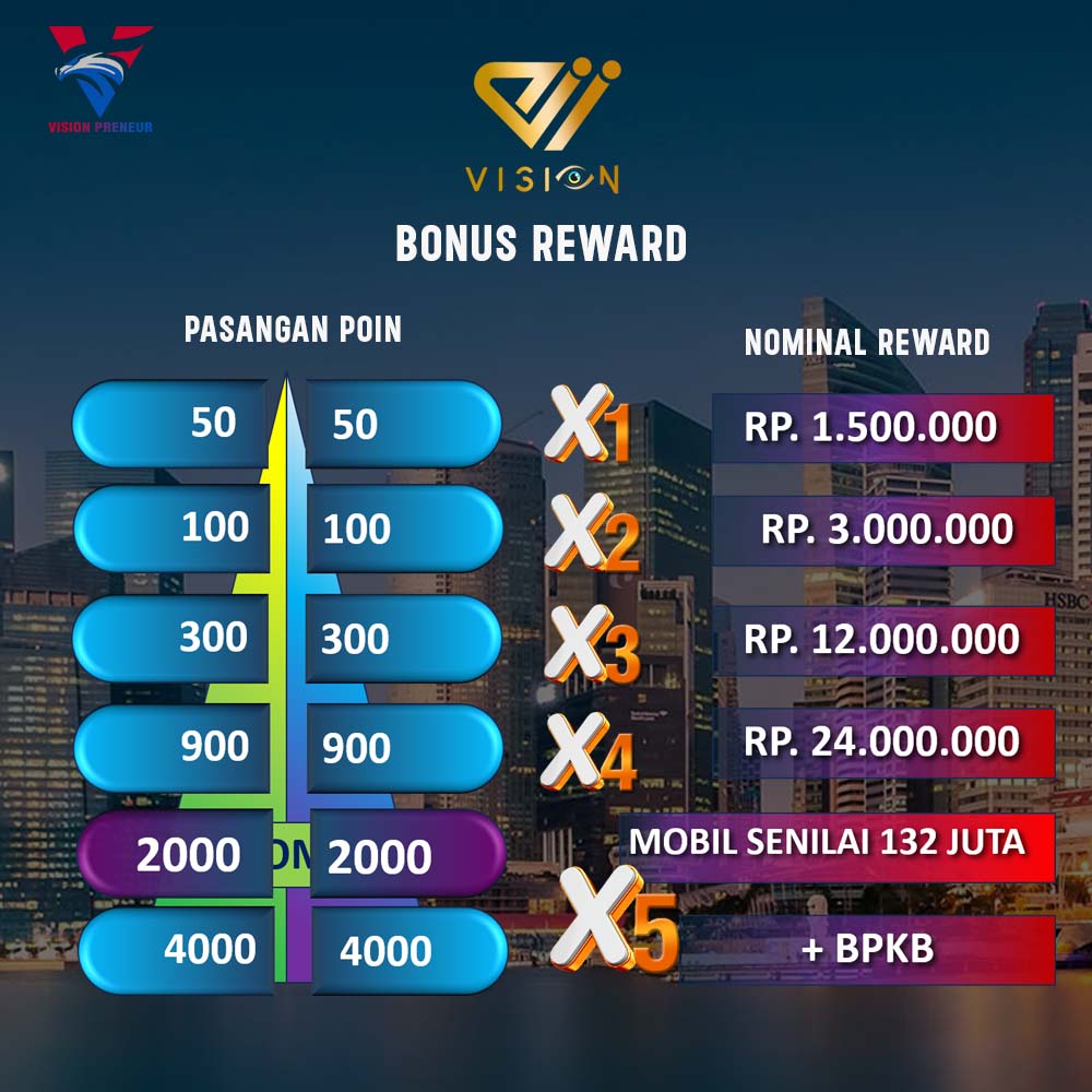 Perhitungan bonus Reward ini berdasarkan pertumbuhan omzet dikedua jalur. Nilai Reward berdasarkan jumlah POIN yang ditentukan.