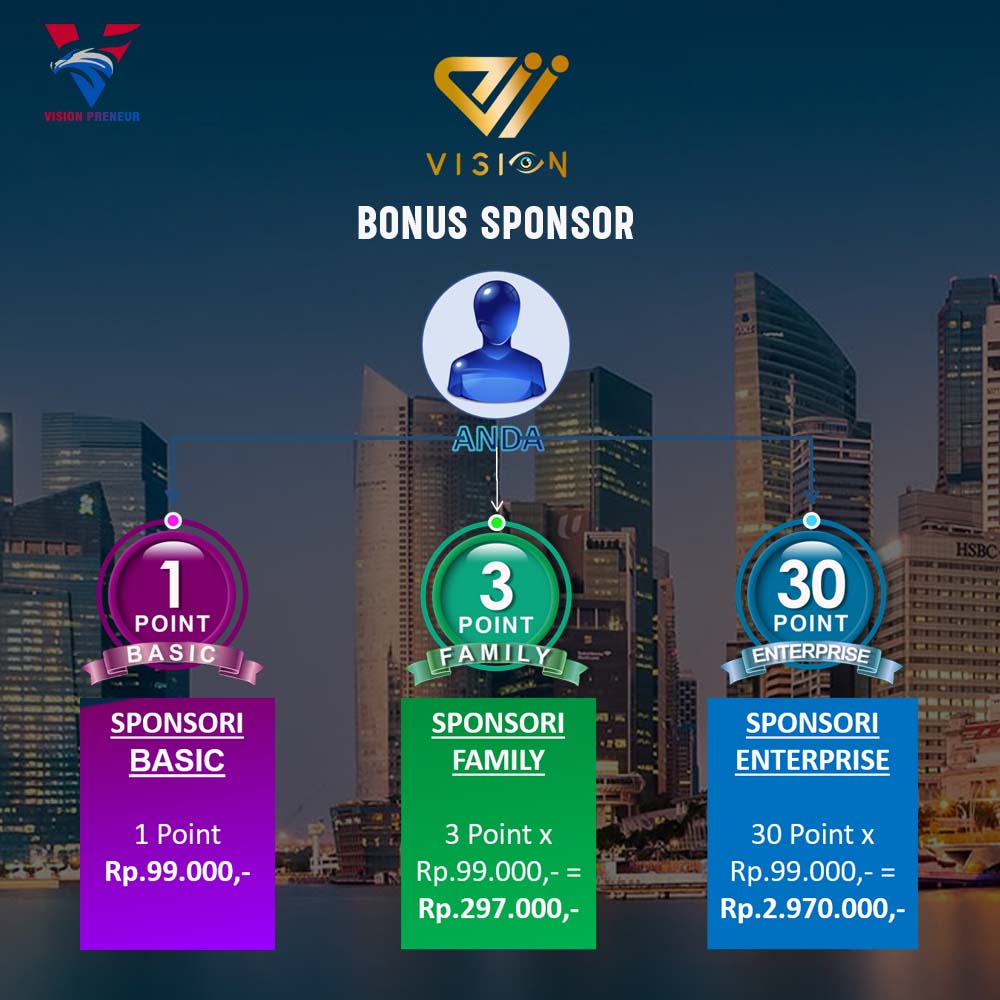 Bonus ini pasti cukup populer dan dikenal juga dengan istilah bonus sponsoring. Nilai bonus Sponsor sebesar Rp.99.000 jika berhasil mensponsori orang baru.